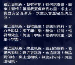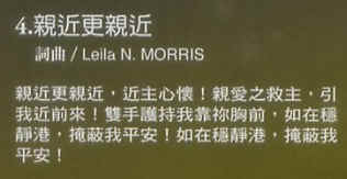 4親近更親近 詞曲/ Leila N. MORRIS 親近更親近,近主心懷! 親愛之救主,引 我近前來! 雙手護持我靠祢胸前,如在穩 靜港,掩蔽我平安! 如在穩靜港,掩蔽我 平安! 親近更親近,我有何能? 有何堪奉獻,而 承主恩情? 惟攜我憂傷痛悔心靈,求主以 寶血完全洗潔淨,求主以寶血完全洗潔 淨。 親近更親近,我惟屬主;罪惡與愚行,甘 心全脫除;撇下罪中樂、驕傲丶炫誇,惟 要得救主,誇主十字架;惟要得救主,誇 主十字架。 親近更親近,終生親近,直到榮耀裡。我 錨已拋穩;親近更親近,永遠親近! 無論 到何時,與主還相親;無論到何時,與主 還相親。 ![]() |
