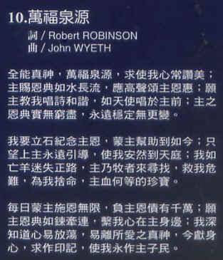 10萬福泉源 詞/ Robert ROBINSON 曲/ John WYETH 全能真神,萬福泉源,求使我心常讚美; 主賜恩典如水長流,應高聲頌主恩惠;願 主教我唱詩和諧,如天使唱於主前;主之 恩典實無窮盡,永遠穩定無更變。 我要立石紀念主恩,蒙主幫助到如今;只 望上主永遠引導,使我安然到天庭;我如 亡羊迷失正路,主乃牧者來尋找,救我危 難,為我捨命,主血何等的珍寶。 每日蒙主施恩無限,負主恩債有千萬;願 主恩典如鍊牽連,繫我心在主身邊,我深 知道心易放蕩,易離所愛之真神,今獻身 心,求作印記,使我永作主子民。 ![]() |