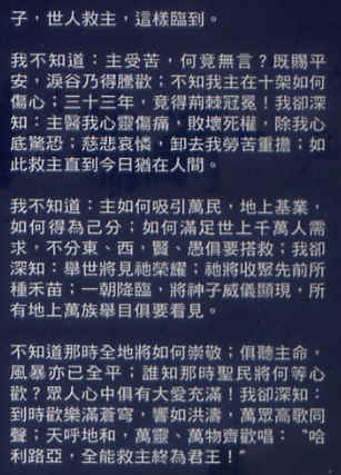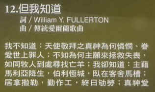 12但我知道 詞/ William Y FULLERTON 曲/傳毓愛爾蘭歌曲 我不知道;天使敬拜之真神為何憐憫、眷 愛世上罪人;不知為何主願來拯救失喪, 如同牧人到處尋找亡羊;我卻知道;主藉 馬利亞降生,伯利恆城,臥在客舍馬槽; 居拿撒勒,勤作工,終日劬勞;真神愛 子,世人救主,這樣臨到。 我不知道;主受苦,何竟無言? 既賜平 安,淚谷乃得騰歡;不知我主在十架如何 傷心;三十三年,竟得荆棘冠冕! 我卻深 知;主醫我心靈傷痛,敗壞死權,除我心 底驚恐;慈悲哀憐,卸去我勞苦重擔;如 此救主直到今日猶在人間。 我不知道;主如何吸引萬民,地上基業, 如何得為己分;如何滿足世上千萬人需 求,不分東、西、賢、愚俱要搭救;我卻 深知;舉世將見祂榮耀;祂將收聚先前所 種禾苗;一朝降臨,將神子威儀顯現,所 有地上萬族舉目俱要看見。 不知道那時全地將如何崇敬,俱聽主命。 風暴亦已全平,誰知那時聖民將何等心 歡? 眾人心中俱有大愛充滿! 我卻深知; 到時歡樂滿蒼穹,響如洪濤,萬眾高歌同 聲,天呼地和,萬靈丶萬物齊歡唱:“哈 利路亞,全能救主終為君王。 ![]() |