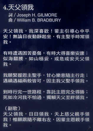 4天父領我 詞/ Joseph H. GILMORE 曲/ William E. BRADBURY 天父領我,我深喜歡! 蒙主引導心中平 安! 無論日夜動靜起坐,有主聖手時常領 我。 有時遭遇困苦憂傷,有時大得喜樂安康; 似海翻騰,如山穩妥,或危或安天父領 我。 我願緊握恩主聖手,甘心樂意隨主行走; 遇禍遇福兩般皆可,因主我父聖手領我。 到時行完一世路程,靠託主恩完全得勝; 死如冷河我不怕過,獨賴天父至終領我。 (副歌) 天父領我,日日領我,天上慈父親手領 我! 惟願跟隨不離右左,因蒙主恩親手領 我。 ![]() |