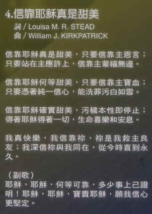 4.信靠耶穌真是甜美 詞/ Louisa M.R. STEAD 曲/ William J. KIRKPATRICK 信靠耶穌真是甜美,只要信靠主恩言, 只要站在主應許上,信靠主蒙福無邊。 信靠耶穌何等甜美,只要信靠主寶血, 只要憑著純一信心,能洗罪污白如雪。 信靠耶穌確實甜美,污穢本性即停止, 得著耶穌得著一切,生命喜樂和安息。 我真快樂,我信靠祢,祢是我救主良 友,我深信祢與我同在,從今時直到永 久。 (副歌) 耶穌,耶穌,何等可靠,多少事上已證 明! 耶穌,耶穌,寶貴耶穌,願我信心 更堅定。 ![]() |