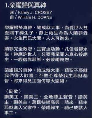 1榮耀歸與真神 詞/ Fanny J. CROSBY 曲/ William H. DOANE 榮耀歸於真神,祂成就大事,為愛世人甚 至賜下獨生子,獻上祂生命為人贖罪受 害,永生門己大開,人人可進來。 贖罪完全救恩,主寶血功勳,凡信者得永 生,神應許世人;只要我眾罪人真心接納 主,一經信靠耶穌,必蒙祂饒恕。 榮歸於真神,祂成就大事,藉聖子耶穌 我們得大歡喜;至聖至尊榮我主耶穌基 督,將來得見主面何等大恩福。 (副歌) 讚美主,讚美主,全地聽主聲音! 讚美 主,讚美主,萬民快樂高興! 請來,藉主 耶穌進入父家中,榮耀歸主,祂己成就大 事工。 ![]() |